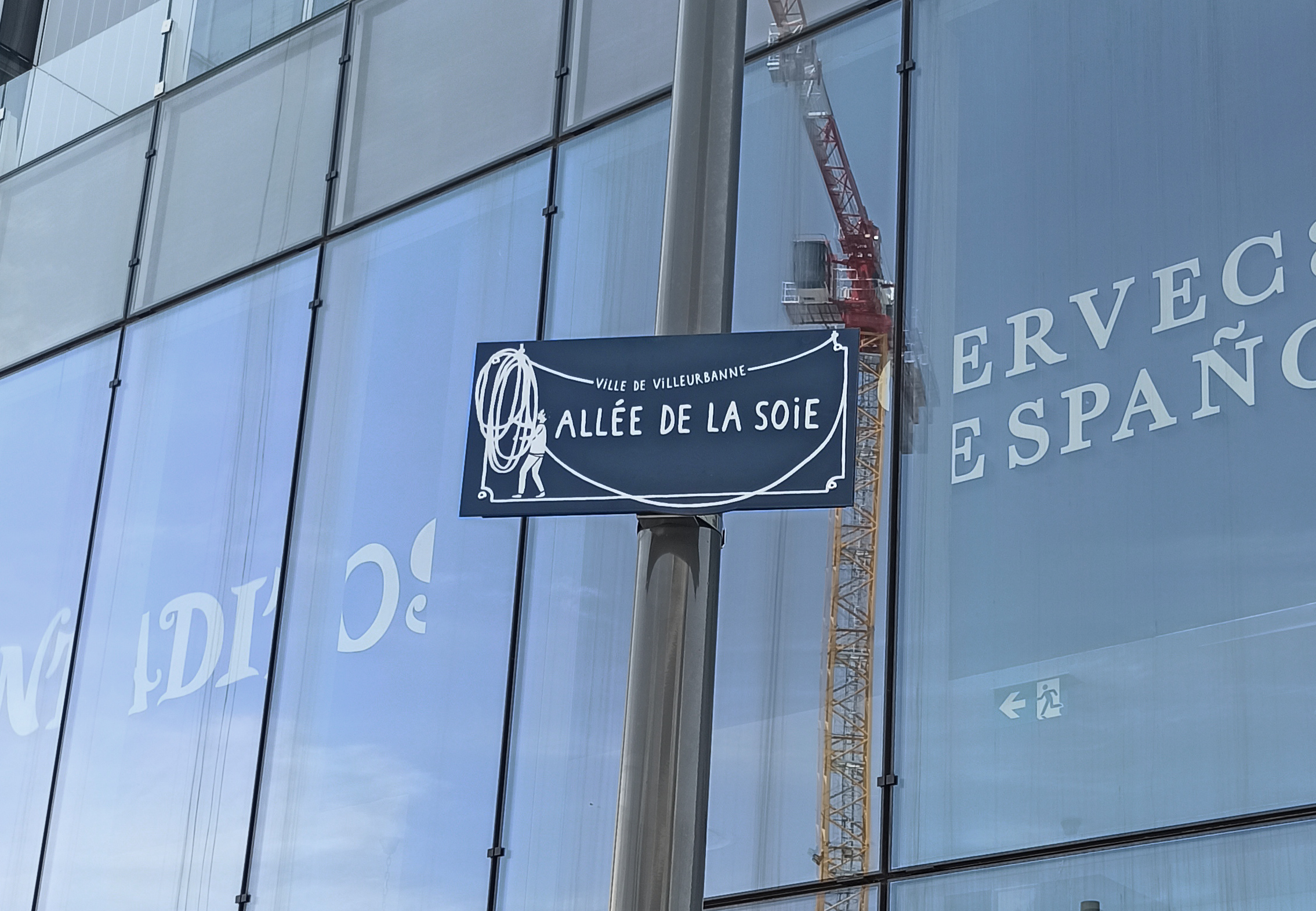 Mon point de départ, c’est le fil de soie, en écho à l’industrie textile qui a marqué l’histoire du territoire. Ces plaques de rue s’inscrivent dans une démarche plus globale, initiée alors que le secteur était encore en chantier, par la réalisation d’une grande fresque murale visible à la sortie du métro. L’objectif était alors d’emmener de la poésie et du décalage pour accompagner les constructions et déconstructions, en mettant en scène un ouvrier déplaçant des éléments de nature, sous la forme d’un grand mécanisme.