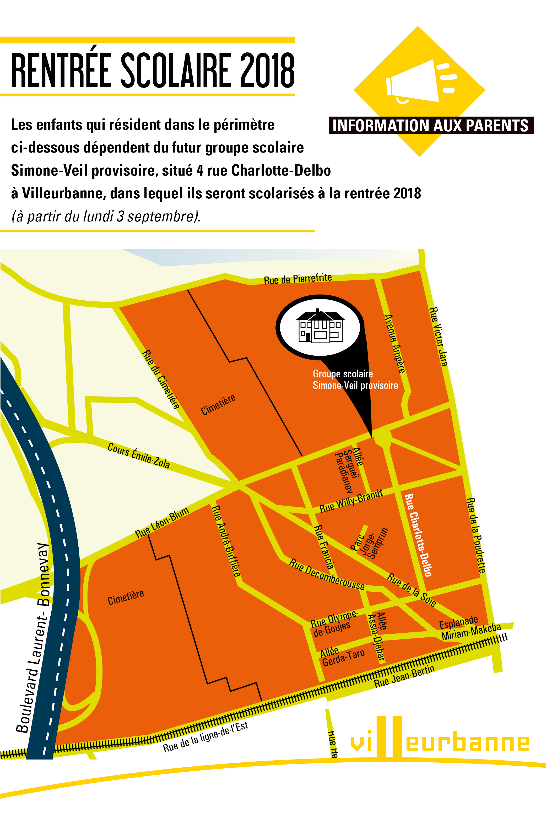 Les enfants qui résident dans le périmètre ci-dessous, dépendent du futur groupe scolaire Simone-Veil provisoire, situé 4 rue Charlotte-Delbo à Villeurbanne.