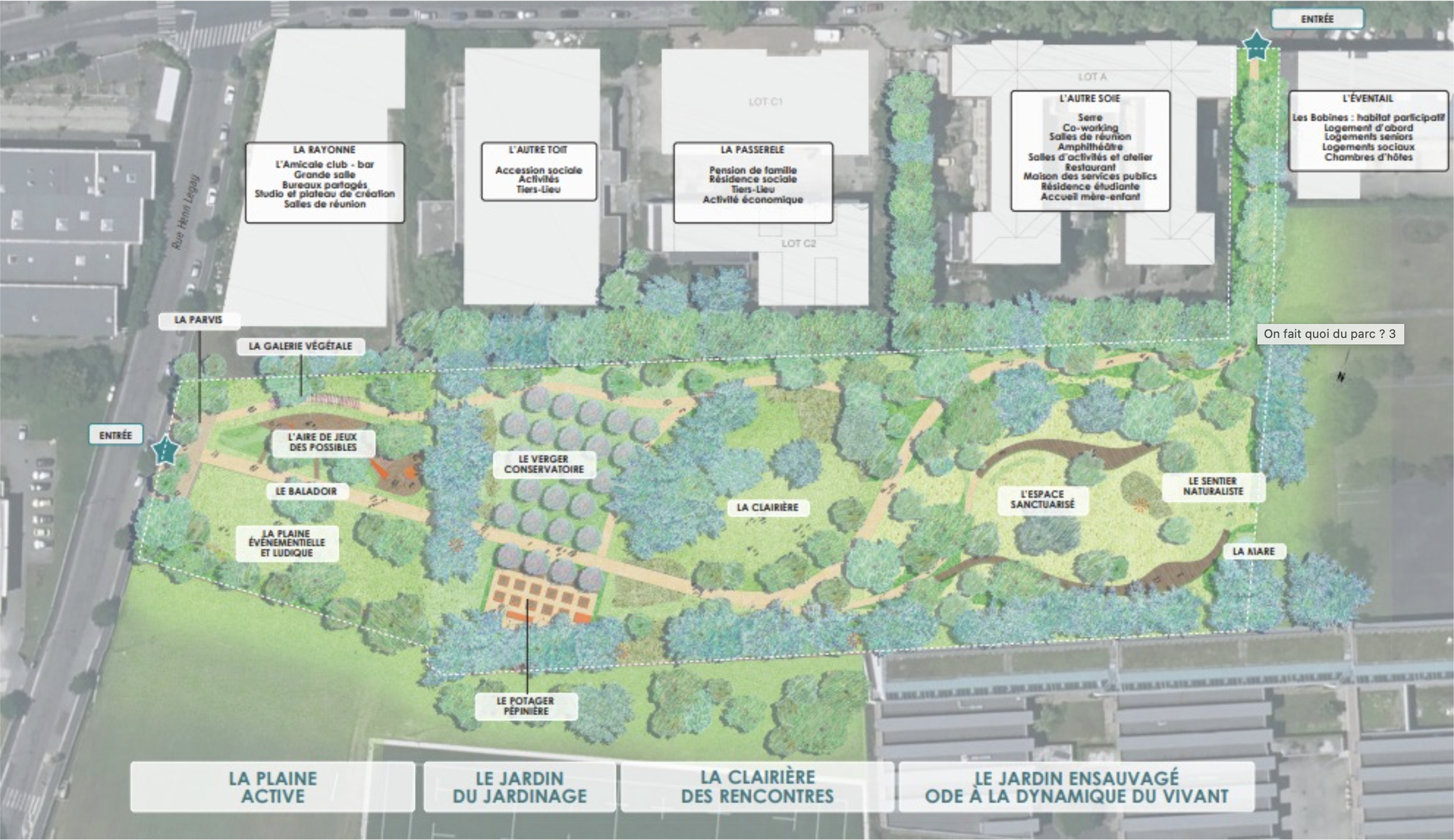 - la « plaine active», qui accueillera une aire de jeux et des espaces libres permettant l’accueil ponctuel de manifestations