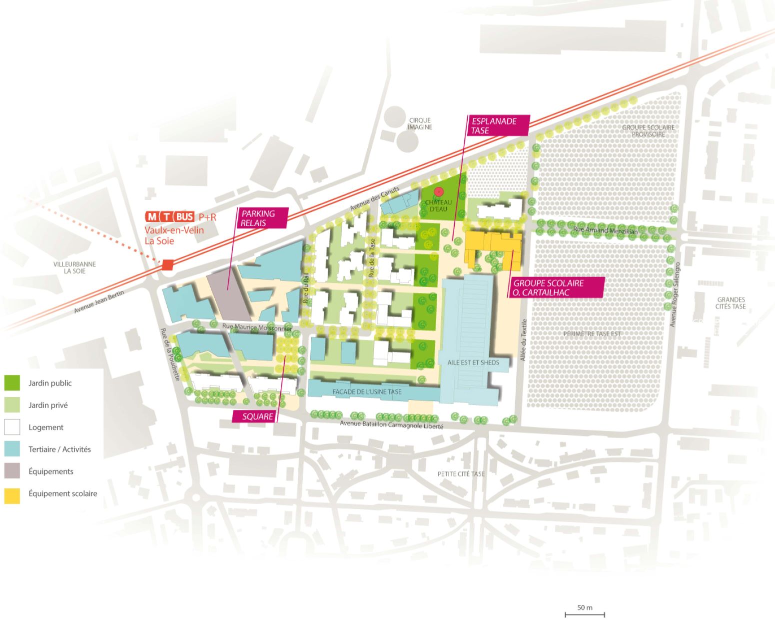 C’est ici que Carré de Soie a engagé sa métamorphose... Sur ce secteur au patrimoine industriel emblématique, autour de l’ancienne usine TASE, usine de textiles artificiels qui s’implante sur un territoire encore rural en 1924. Aujourd’hui, le secteur Vaulx-en-Velin La Soie accueille de nombreux habitants et entreprises (Veolia, Technip, des acteurs de l’innovation sociale...) mais aussi de nouveaux espaces et équipements publics.