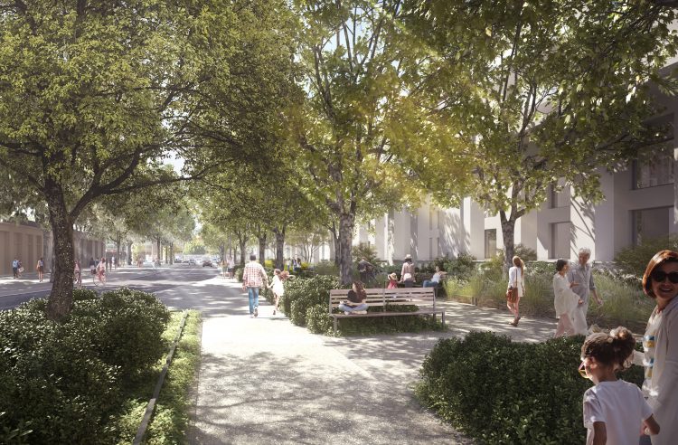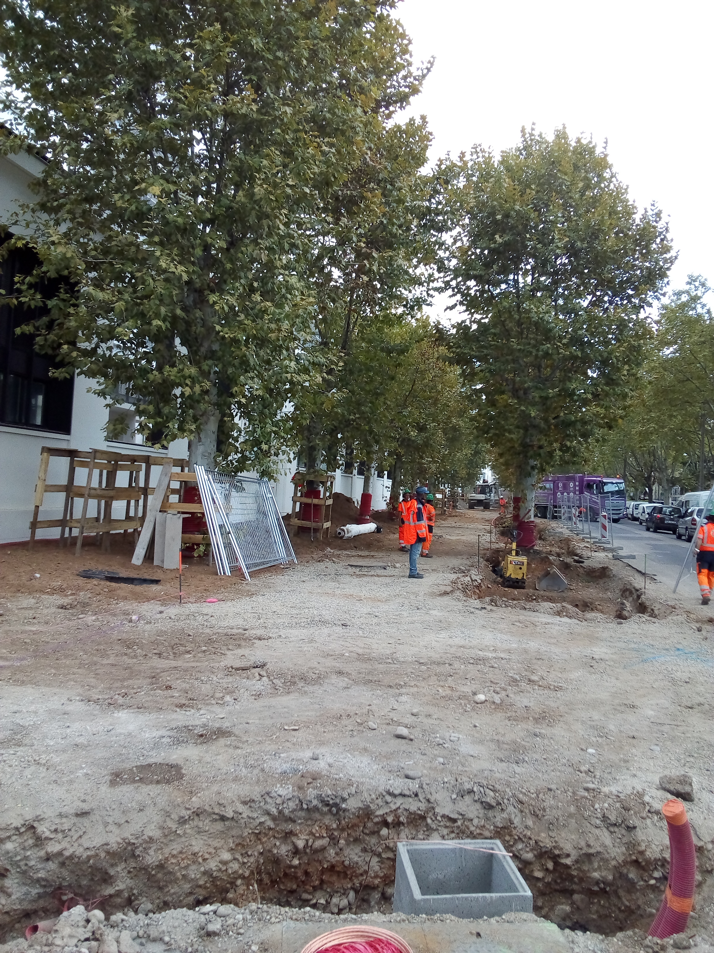 L’aménagement paysager du trottoir sur l’avenue Bataillon Carmagnole Liberté a également débuté avec la reconstitution de l’alignement de platanes et l’aménagement des circulations piétonnes, le tout au pied de l’ancienne façade préservée.