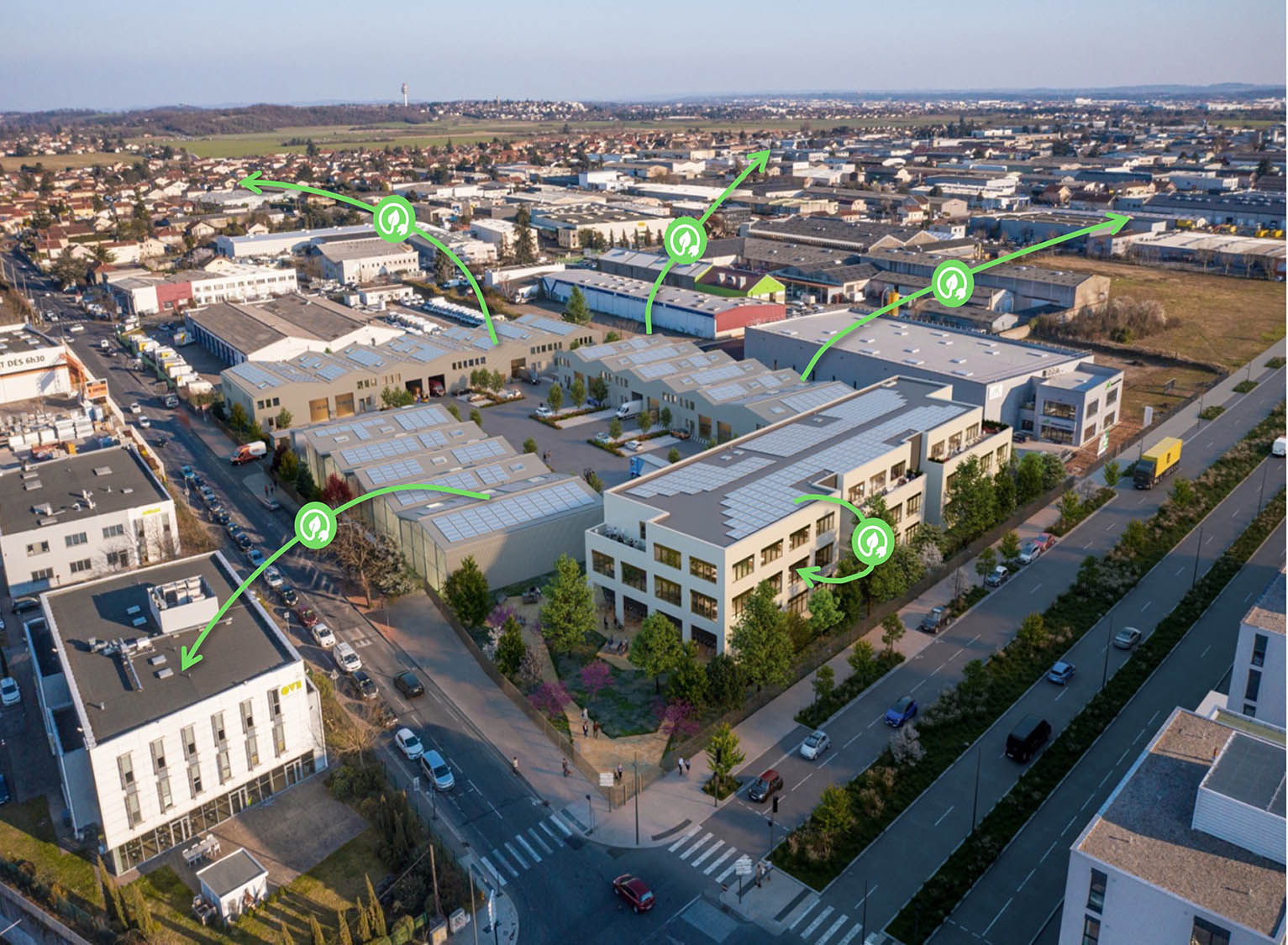 Pôle tertiaire, Carré de Soie est également un territoire cible de renouvellement et de développement pour l’économie productive sur la Métropole de Lyon. Livré en novembre 2023, le parc d’activités des Portes de la Soie à Vaulx-en-Velin, est symbolique des nouvelles formes possibles pour le tissu industriel, avec une utilisation économe du foncier et des espaces d’activités modulables. Il héberge aussi aussi la plus grande opération d’autoconsommation collective d’énergie renouvelable de la région, avec 1530 panneaux photovoltaïques installés en toiture, produisant une énergie verte consommée sur place ou dans le quartier environnant. Â